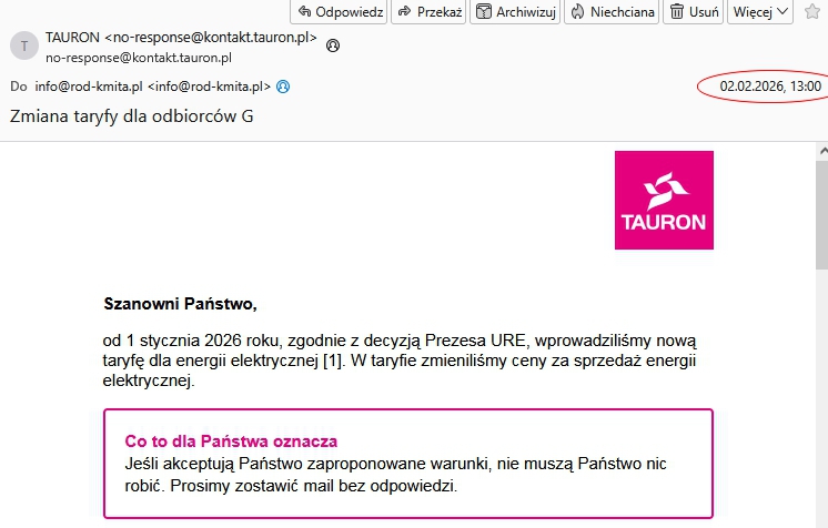 Powyżej e-mail otrzymany od Tauronu na naszą skrzynkę pocztową (2 lutego 2026)