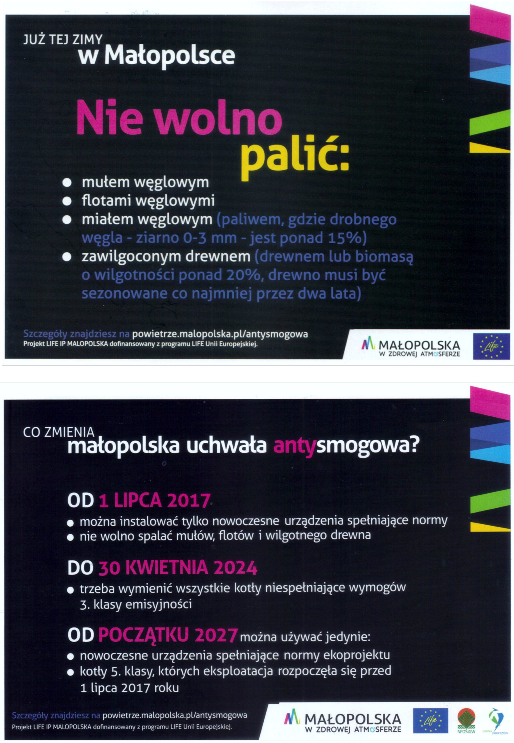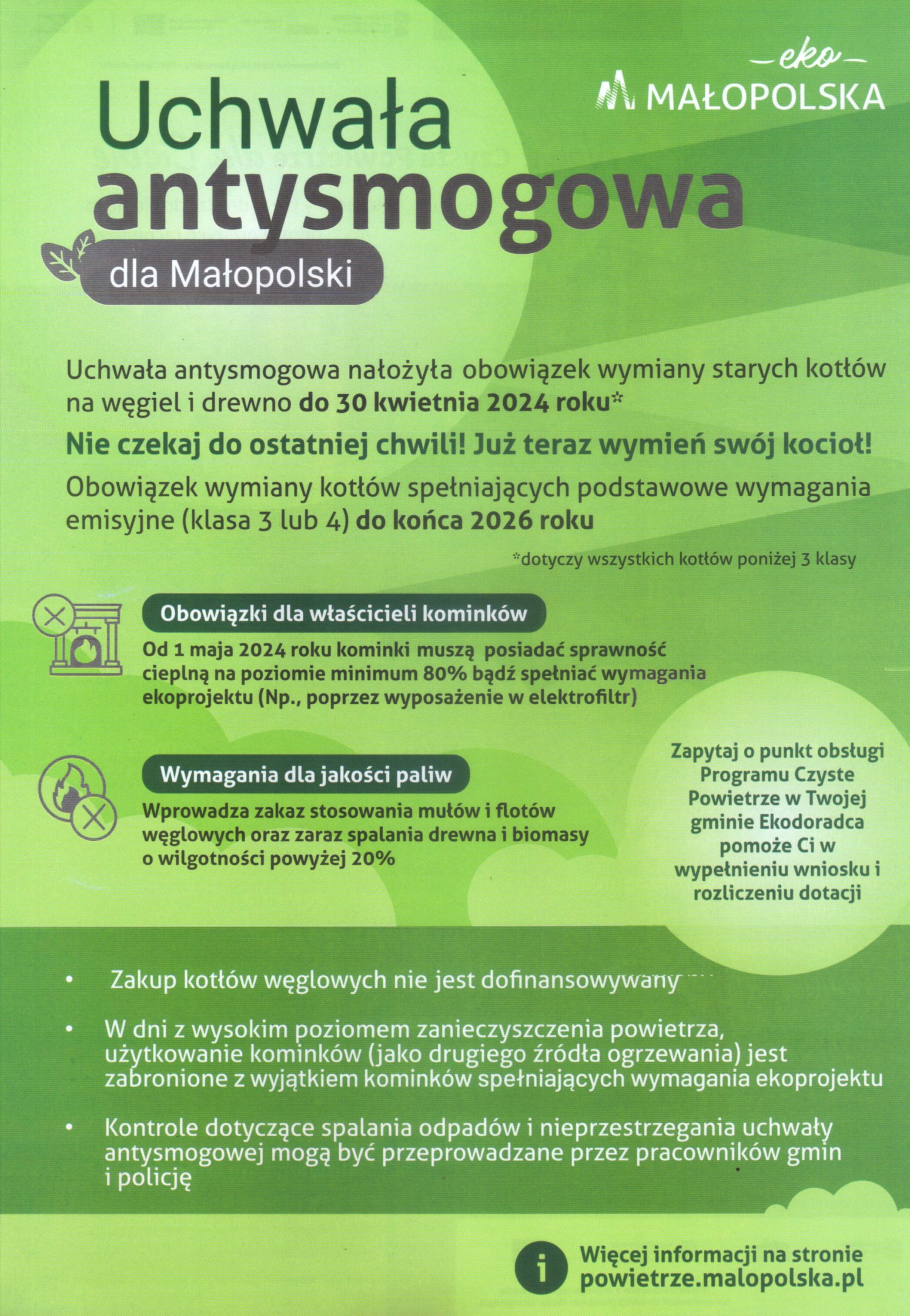 Zgodnie z zaleceniami po kontroli przeprowadzonej przez przedstawicieli Urzędu Gminy informujemy, że według uchwały antysmogowej obowiązującej w gminie Zabierzów zabronione jest używanie kominków niespełniających norm. Od 1 maja 2024 roku kominki muszą posiadać sprawność cieplną na poziomie min. 80% bądź spełniać wymagania ekoprojektu (elektrofiltr). Kontrole dotyczące spalania odpadów i nieprzestrzegania uchwały antysmogowej mogą być przeprowadzane przez pracowników gminy i policję.